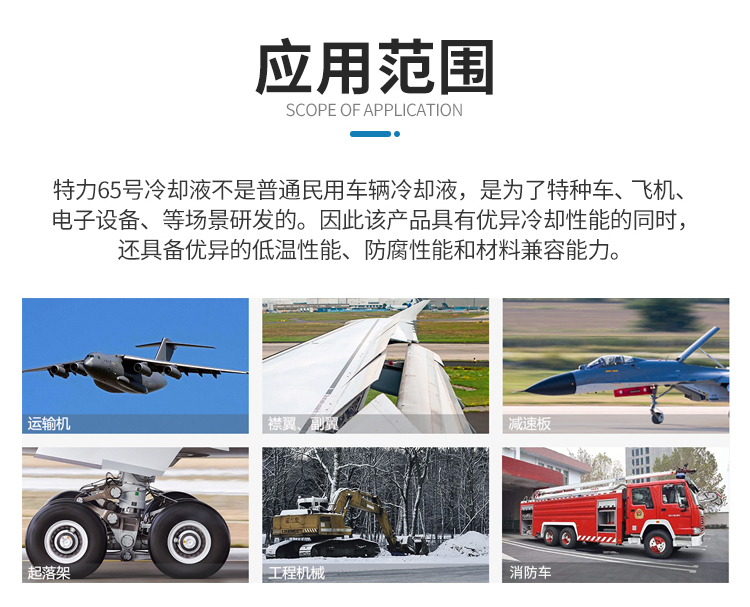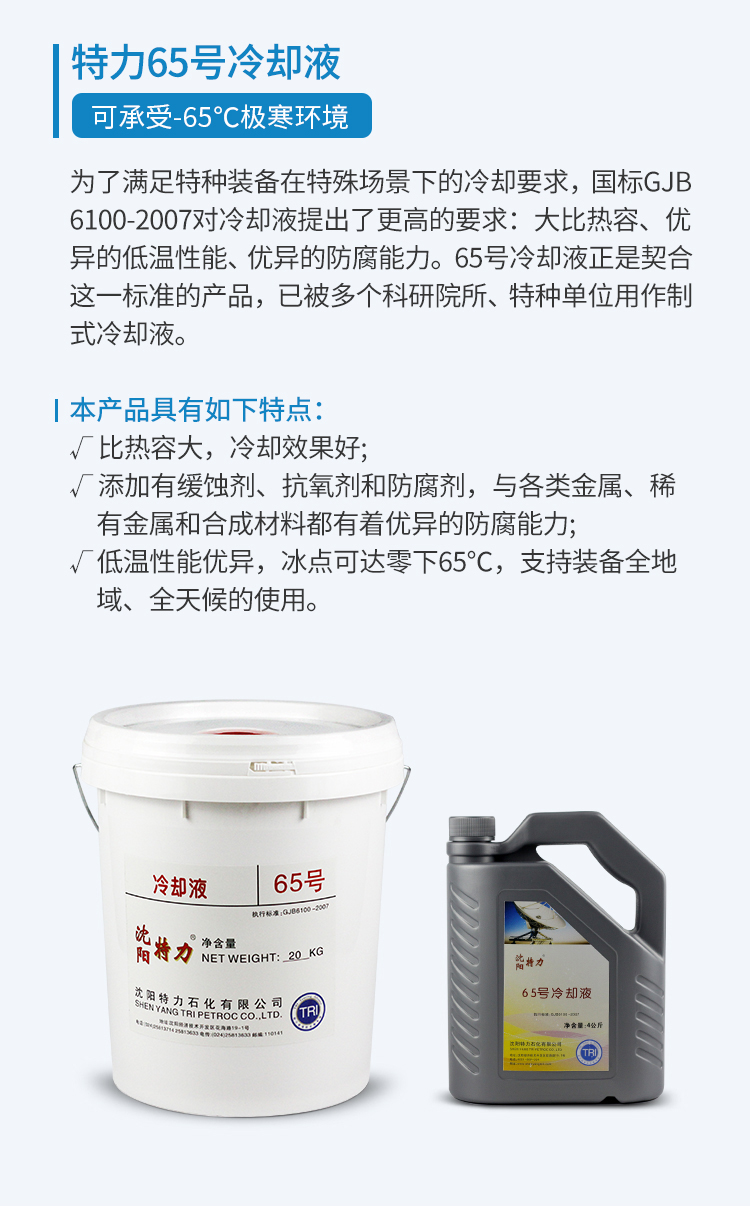 為了滿(mǎn)足特種裝備在特殊場(chǎng)景下的冷卻要求,國(guó)軍標(biāo)GJB 6100-2007對(duì)冷卻液提出了更高的要求:大比熱容、優(yōu)良的低溫性能、優(yōu)良的防腐能力。65號(hào)冷卻液正是契合這一標(biāo)準(zhǔn)的產(chǎn)品,已被多個(gè)科研院所、部隊(duì)單位用作制式冷卻液。主要有以下特點(diǎn):