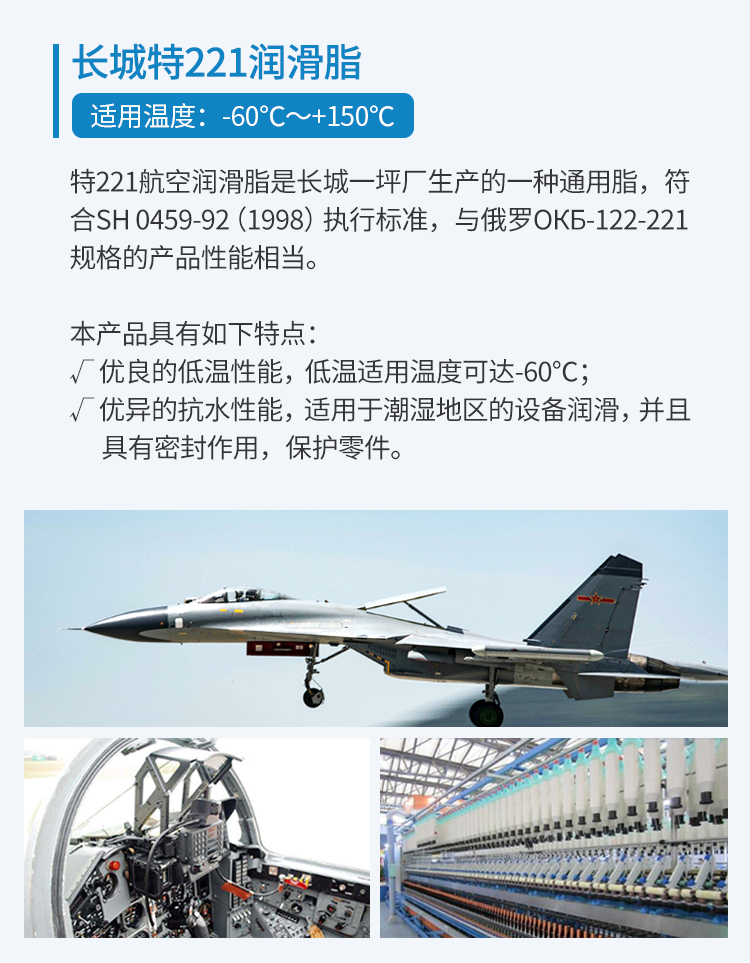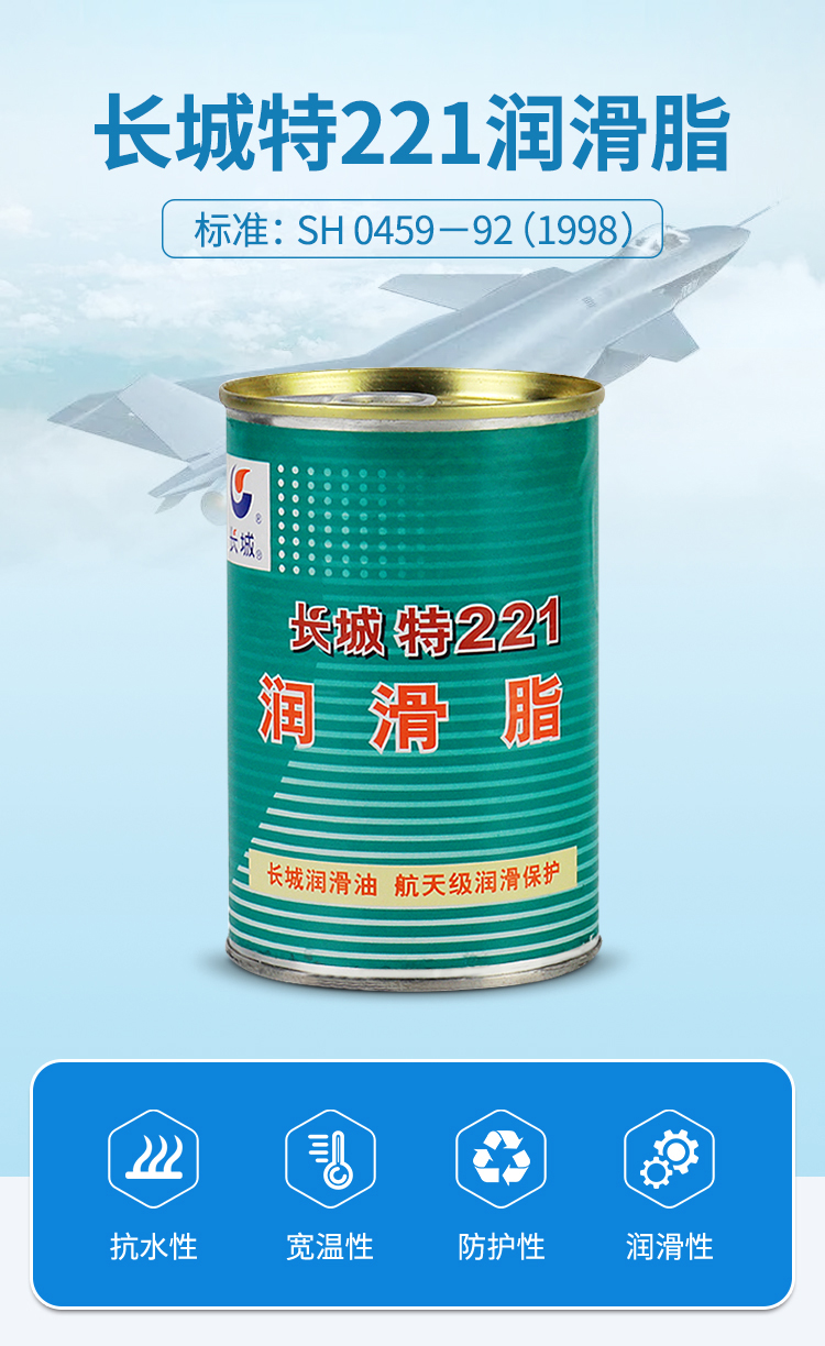 特221航空潤滑脂是長城一坪廠生產的一種通用脂,符合SH 0459-92(1998)執行標準,具有抗水性,適用于潮濕地區設備的潤滑。本產品是采用復合稠化劑稠化合成油精制而成的潤滑脂。