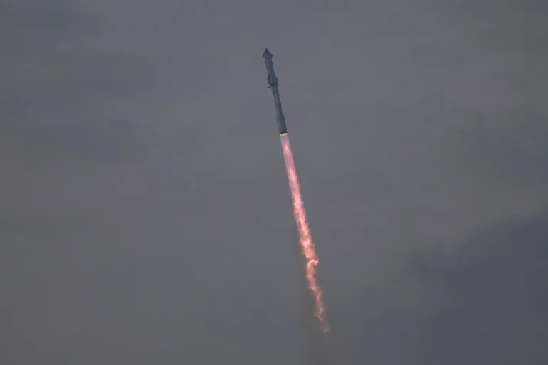 由馬斯克創立的SpaceX公司直播了最近的星際飛船實驗,下面是SpaceX的火箭星際飛船“星艦”在德克薩斯州博卡奇卡發射場的Starbase進行第三次試飛,穿過云層和薄霧的景色。