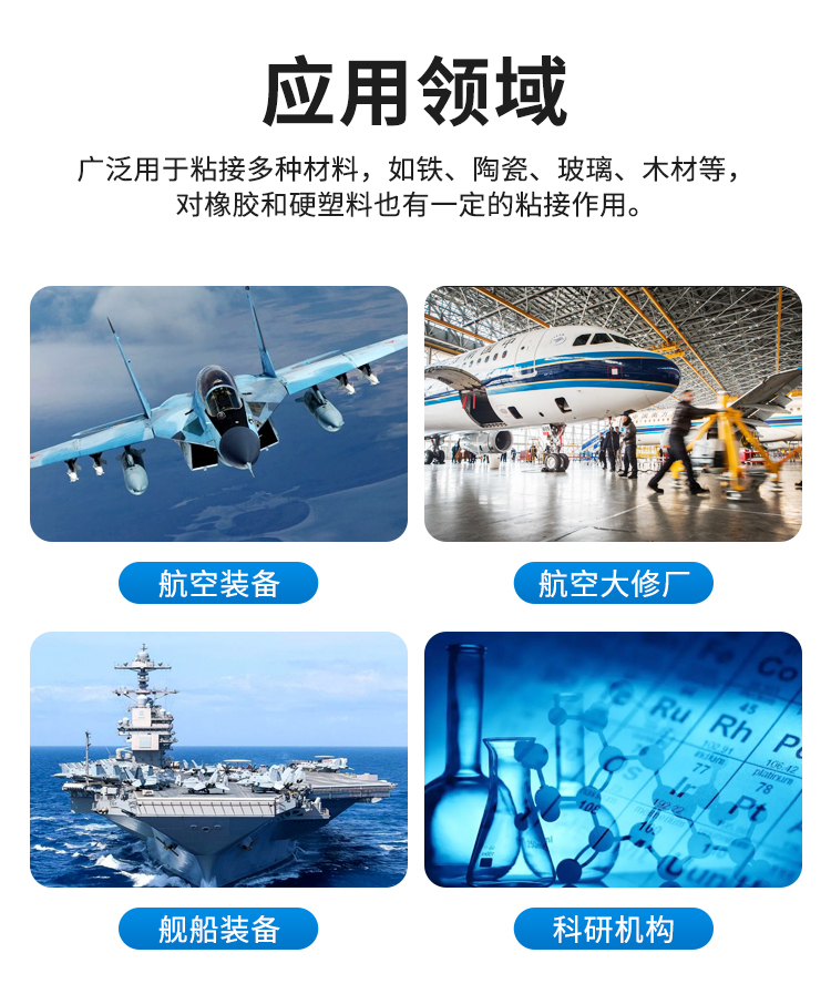 • 廣泛用于粘接多種材料,如鐵、陶瓷、玻璃、木材等,對橡膠和硬塑料也有一定的粘接作用。