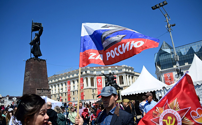 除莫斯科外,從太平洋的符拉迪沃斯托克到中歐的加里寧格勒,其他 27 個(gè)俄羅斯城市也舉行了規(guī)模較小的游行??傮w而言,超過50,000名士兵參加了游行。上圖顯示為遠(yuǎn)東城市符拉迪沃斯托克舉行的勝利日慶祝活動(dòng),一名男子手持帶有字母 Z 的俄羅斯國旗。