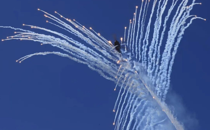 這是由4架直10組成的菱形隊伍,到達觀眾區(qū)后4架直10突然同時拉起、飛到頂點后打出漂亮的干擾彈,之后四架飛機朝四個不同的方向倒轉(zhuǎn)飛行,數(shù)秒內(nèi)在天空中形成一個絢麗的“花朵”,完美地展現(xiàn)了四機開花的驚艷。