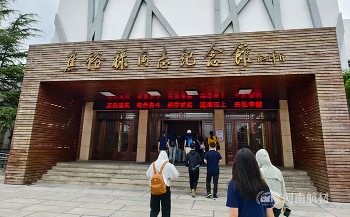 紀念館主體建筑則飽含莊重與現代的張力:素雅的白墻以利落線條指向蒼穹,木質底座堅實托舉"焦裕祿同志紀念館"的金色招牌。門楣電子屏上,焦裕祿精神內核陳列其中:"親民愛民,艱苦奮斗,科學求實,迎難而上,無私奉獻"。