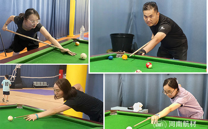 臺球桌成為他們的競技場,袁總一襲黑衣修身勾勒沉穩(wěn)氣場,俯身架桿似磐石,視線銳利穿透彩球軌跡。球桿疾推白球沖出,這是策略與技術(shù)的完美結(jié)合!場邊的伙伴或靜觀沉思,或躍躍欲試,沉穩(wěn)之中見鋒芒,正是航材人工作中的細(xì)致底色。